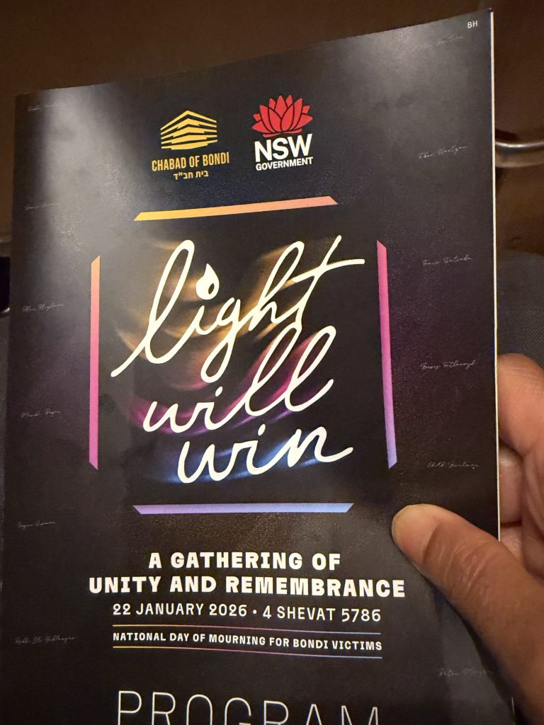 We had come together for the National Day of Mourning, an event aptly named “Light Will Win”, to honour the 15 precious lives taken in the Bondi Beach terror attack on 14 December 2025 – an act that targeted Jewish Australians during a Hanukkah celebration, and shook the soul of our nation.