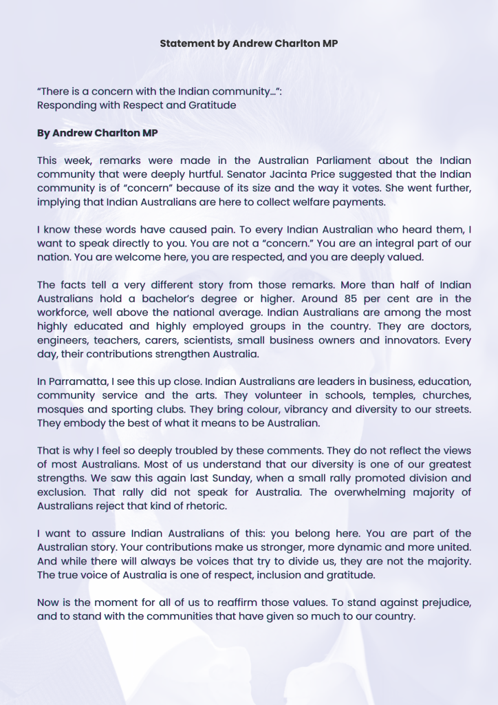 When a community is singled out in the national parliament as a “concern,” words can wound far beyond the chamber walls. This week, Dr Andrew Charlton MP answered that moment with something rarer in political life: moral clarity. In a statement addressed directly to Indian-Australians, Charlton said, unequivocally, “You are not a ‘concern.’ You are an integral part of our nation… welcome here, respected, and deeply valued.” It was more than a rebuttal – it was a standard. It articulated the Australia most of us recognise: confident, plural, and grateful to the people who build it every day.